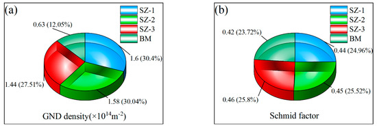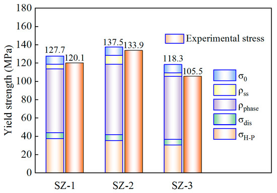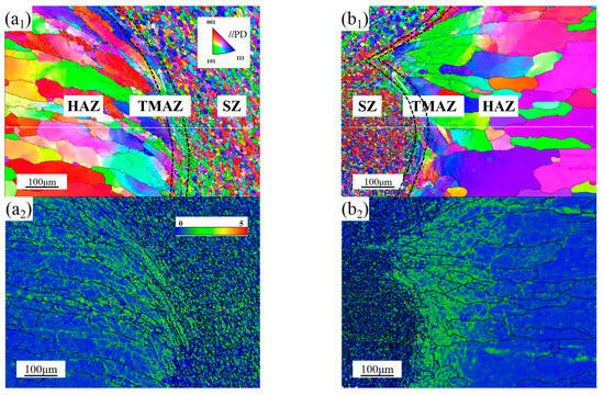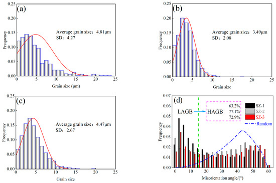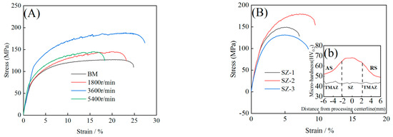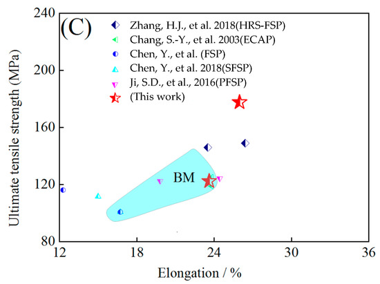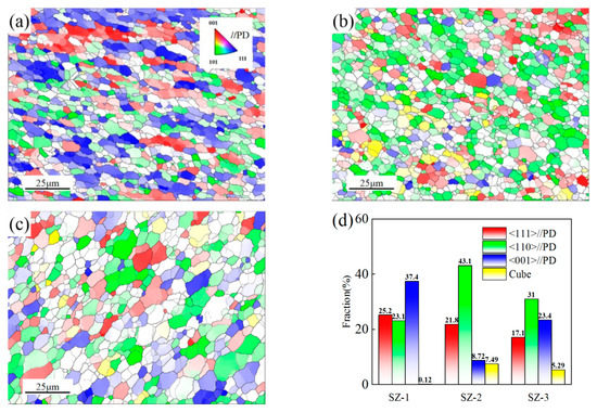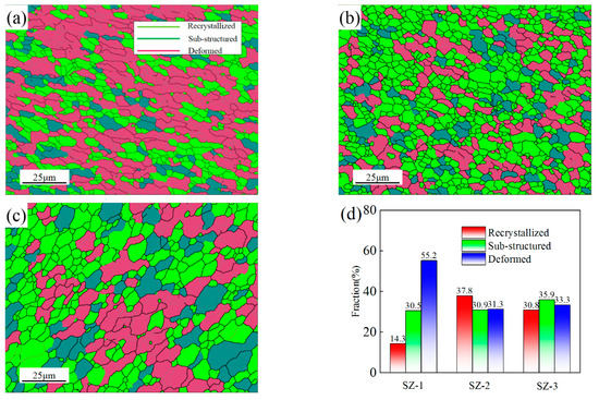 - The plastic–elastic interface is composed of deformed grains and recrystallized grains. Deformed grains produce dislocation gradients by affecting the distribution of dislocations and promote the initiation of more slip systems. Meanwhile, the recrystallization proportions in SZ-1, SZ-2 and SZ-3 are 14.3%, 37.8% and 35.9% respectively, which provide sufficient plasticity for aluminum alloy. These can facilitate strain hardening and improved ductility and are composed of deformed grains and recrystallized grains. Deformed grains produce dislocation gradients by affecting the distribution of dislocations and promote the initiation of more slip systems. Meanwhile, the recrystallization proportions in SZ-1, SZ-2 and SZ-3 are 14.3%, 37.8% and 35.9% respectively, which provide sufficient plasticity for aluminum alloy. These can facilitate strain hardening and improved ductility.