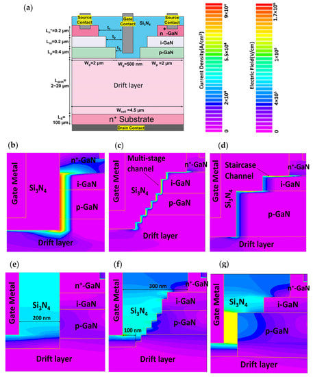 In order to obtain an in-depth study of the device, a systematic approach to performance analysis is carried out. The model is simulated based on standard semiconductor device physics using Poisson’s equation, carrier continuity equation, and transport equation. Moreover, the breakdown characteristic is calculated by considering Selberherr’s impact ionization model [27,28,29]. The staircase device structure is shown in Figure 1a. In practice, the fabrication of a staircase channel device can be realized by first performing three ICP-RIE (Inductively Coupled Plasma–Reactive Ion Etching) steps; each stops at i-GaN, p-GaN, and n-type drift layer. The etched thickness (though there is tolerance of an over-etch of each step) can be precisely monitored with plasma end-point detection during ICP-RIE etching. Multi-dielectric layer coating with a total thickness higher than 900 nm is proposed to fill up the staircase trench followed by source contact VIA hole etching and source electrode deposition. The gate electrode can be then deposited after the gate VIA hole definition. The drain contact is coated after the drift layer is grinded to the desired thickness. Multiple etching steps increase surface roughness and induce defects which may degrade the carrier mobility. Such surface defects can be effectively passivated with a proper recipe of GaN etching and dielectric deposition. Additionally, some advanced etching methods, such as digital etching with N2 plasma treatment, can minimize exposed defects [30]. Parametric analysis is performed based on two major parameters: device geometry and doping concentrations. As shown in Figure 1, the model is studied by varying the drift length (Ldrift) of the drift layer between 2 and 20 µm and drift doping concentration (ndrift) between 5 × 1015 and 5 × 1016/cm3. The gate to n+-GaN, i-GaN, and p-GaN length, t1, t2, t3, is 300, 200, and 100 nm, respectively. The typical value of p-GaN doping concentration (np), source contact n+-GaN doping concentration (n+), and ndrift is kept at 2 × 1017, 8 × 1018, and 1 × 1016 cm−3, respectively. To highlight the dependence of electrical properties on the device profile near the gate-source region, we compared the proposed staircase structure with the traditional straight channel trench gate (see Figure 1b) and multi-stage staircase (see Figure 1c) structures. The purpose of the multi-stage staircase profile is to understand the electrical field and current distribution when multiple-step etching is applied to the staircase device. It can be considered as a tapered structure if the number of staircase steps is infinite. The gate to channel distance is 200 nm for a straight channel device while that of a multi-stage channel device decreases from 300 to 100 nm as labeled in Figure 1e,f. The epi-structures of all three types of devices are the same throughout the study.