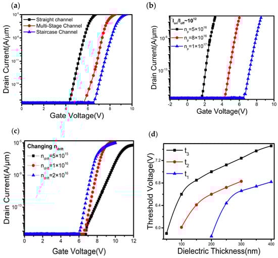Vth is one of the key parameters to understanding the device’s switching and leakage performance. A greater value of Vth (generally greater than 3 V) is always expected in high-power applications. Conceptually, it is mainly determined by the p-type and n-type drift layers. The comparative transfer characteristics between straight, multistage, and staircase channels are shown in Figure 2a, in which staircase structure exhibits a higher threshold voltage than the other two types of transistors. For the staircase channel transistor, the variation of Vth with respect to different values of np is plotted in Figure 2b. It is observed that the Vth significantly increases with np. Since a higher np has a stronger depletion and reverse field, it requires a larger gate to source potential (Vgs) to accumulate carriers at the dielectric-semiconductor interface and to switch on the device. Hence a large Vth, extracted from linear extrapolation of the transfer curve, around 6.6 V can be achieved at np of 1 × 1017 cm−3 while keeping ndrift, Lp, Ldrift at 1 × 1016 cm−3, 200 nm, and 12 µm, respectively. Figure 2c also shows a slight dependence of Vth on the ndrift. Variations of Vth to t1, t2, and t3 of the staircase device are explored in Figure 2d. The thickness of a certain parameter is varied by keeping the rest two to their original assigned values. Vth is calculated using linear extrapolation of the transfer curves. It demonstrates that Vth increases with layer thickness.
