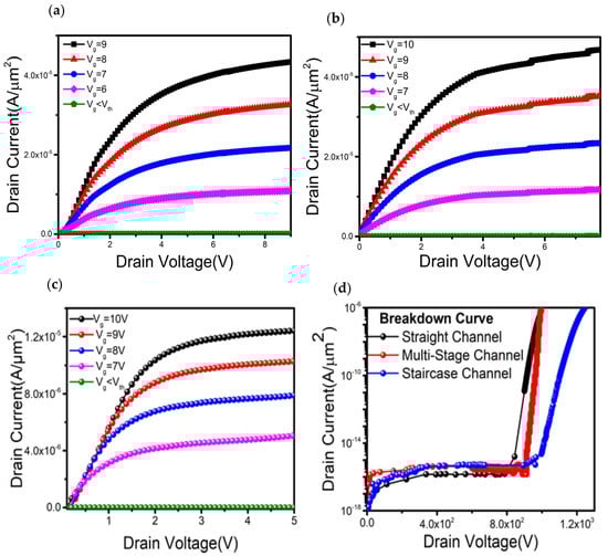 (a) Output characteristics of the straight channel trench channel transistor. (b) Output characteristics of the multi-stage channel transistor. (c) Output characteristics of the staircase channel transistor. (d) Comparisons of breakdown characteristics of the straight channel trench gate, multi-stage staircase and staircase channel transistors, where the layer thickness and corresponding doping concentration are kept the same for all structures.