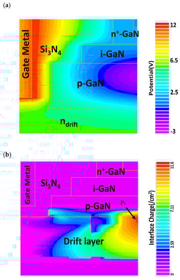 Conceptually, a larger Ldrift with a smaller ndrift can help distribute the field generated by large drain voltage so that the effective field is lower than the critical field for avalanche breakdown. Therefore, parameter optimization is crucial to satisfy different application requirements. The variation of the staircase channel potential is depicted in Figure 4a. It is observed that the channel potential at dielectric/semiconductor interface is strong and exponentially decays away from the interface. The channel potential gradient is lower in the intrinsic region than that in the p-GaN region, which is one of the reasons for a broader carrier distribution in the intrinsic region. The breakdown occurs as a result of an avalanche process triggered by impact ionization. At a very high drain to source potential, electrons at p-GaN and drift n-GaN interface obtain high kinetic energy and undergo scattering events, where the excess energy transferred to neighboring atom, generating new electron-hole pairs. This process continues and rapid carrier multiplication occurs. Sudden surge in generated carriers results a direct current flow between n+ source and drain terminal, hence the gate loses its control over the channel and avalanche breakdown occurs. The generation rate of interface charges by impact ionization is represented in Figure 4b. It is observed that the impact ionization rate is maximum at the edges as indicated as point P1.