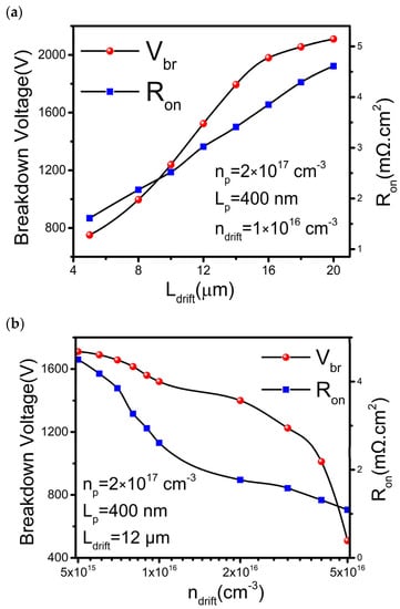 In general, the optimization is performed based on the desired application. In this study, optimization is carried out to achieve balanced performance between high Vbr and low Ron. First, the Ldrift is optimized while maintaining other parameters, np, Lp, and ndrift, constant at 2 × 1017 cm−3, 400 nm, and 1 × 1016 cm−3, respectively. The Ldrift varies from 2 to 20 µm. As shown in Figure 5a, the Vbr increases with Ldrift but gradually saturated when Ldrift exceeds 16 µm. On the other hand, the Ron increases linearly with Ldrift. By setting Ldrift to be 12 µm, we can obtain a Ron of 2.61 mΩ∙cm2 and a Vbr of 1.52 kV. Next, the ndrift is optimized by keeping Ldrift at 12 µm, as plotted in Figure 5b. By increasing ndrift, the Vbr is reduced. The result is due to the reduced Ron when the carrier density between the source and drain increases. When the ndrift is larger than 1 × 1016 cm−3, a sharp decrease of Vbr but a slow decrease of Ron is observed. Hence, the ndrift around 1 × 1016 cm−3 or lower is most acceptable for high-power applications.