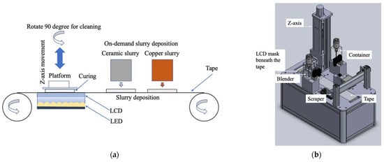 A platform on a driving screw powered by a motor rotates 90 degrees around the Z-axis when cleaning is required. Two scrapers are used to separate scrapping the ceramic and copper slurries to prevent the slurries from mixing. Figure 1b shows the design for the tape-casting multi-slurry 3D printer. Two containers with blenders filled with ceramic and copper slurries deposit slurry on the tape on demand. After the material is deposited on the tape, the tape will move until a new print area is right above the LCD, then the LCD will display the pattern generated by the layer pattern generator. This process will repeat layer by layer until it finishes printing.