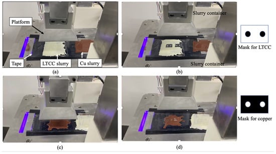 Figure 3 shows the tape-casting multi-slurry 3D printing process for the assembled printer. Figure 3a shows the LTCC and copper slurries deposited on the tape, and the platform is moved down until the desired print layer thickness is achieved. Figure 3b shows the photopolymerized LTCC, which adheres to the platform. The photo on the right shows the mask for this print layer. When exposure is completed and the platform is raised, the photomask looks like the pattern of the printed LTCC slurry layer. Figure 3c shows the platform moving down in preparation for printing the copper slurry. Behind the copper slurry is the LTCC slurry that is deposited. Figure 3d shows the completion of copper slurry printing. The image on the right shows the mask for this print layer. This 3D printing process is repeated to allow printing using two different slurries.