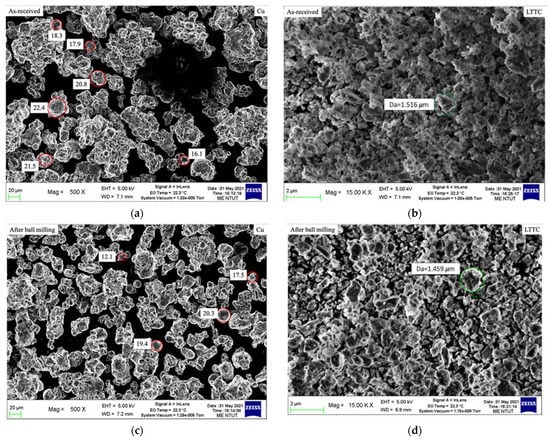 SEM images of LTCC and copper powder for as-received and after ball milling: (a) as-received of LTTC; (b) as-received of Cu; (c) after ball milling of LTTC; (d) after ball milling of Cu.