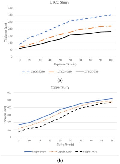 Cured layer thickness for different weight ratios and different exposure times: (a) LTCC and (b) copper slurry.