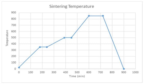 This study uses a three-stage sintering process and the result of thermogravical analysis is shown in Figure 7. In the first stage, the green body is heated to 350 °C at a heating rate of 2 °C/min and maintained at that temperature for 1 h before the resin is evaporated. The temperature is then increased from 350 °C to 500 °C at a heating rate of 10 °C/min and then maintained at 500 °C for 1 h to ensure that all resin is evaporated. The temperature is then increased from 500 °C to 850 °C in 150 min and the specimen is sintered for 2 h at 850 °C, and then cooled in the furnace to room temperature at a rate of 50 °C/min. The success rate for sintering is increased by including glass in the composition of LTCC, but studies show that the composition of the glass also affects the dielectric loss [17].