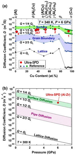 Ultra-fast diffusion during ultra-SPD. Estimated diffusion coefficients during ultra-SPD processing via HPT (red circles) for (a) Al-Cu alloy plotted against Cu content and (b) Al-Zr alloy plotted against pressure in comparison with the reference data calculated using activation energy for lattice diffusion QL, grain boundary diffusion (1/2–2/3)QL, and surface diffusion (1/4–1/3)QL [24,26].