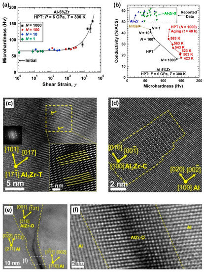 Figure 2 shows the results achieved using ultra-SPD via the HPT method for an immiscible Al-5Zr (wt%) alloy [26]. The hardness of samples processed with conventional ranges of shear strain is saturated to an apparent steady-state level below 70 Hv, while a significant increase in hardness to about 140 Hv occurs at shear strains over 1000, as shown in Figure 2a. Further heating of the sample to up to 523 K results in age hardening and a further increase of hardness, while the hardness and electrical conductivity of the material remain well stable up to 583 K, as shown in Figure 2b. Moreover, Figure 2b shows that the hardness of ultra-SPD-processed Al-Zr is higher than all data reported so far for the Al-Zr-based alloys even after SPD processing. An examination of the microstructure of this Al-Zr alloy by high-resolution transmission electron microscopy, shown in Figure 2c–f, confirms that such a high hardness and good thermal stability is not only due to the presence of thermodynamically stable Al3Zr intermetallics with the tetragonal structure but also due to the precipitation of orthorhombic AlZr intermetallics at grain boundaries and coherent cubic Al3Zr intermetallics in grain interiors [26].