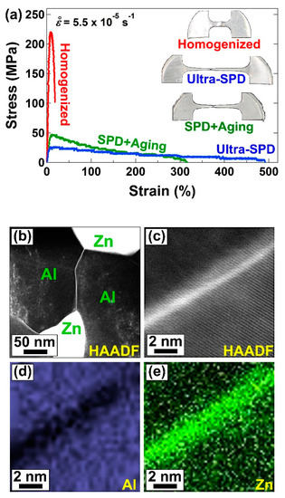 The ultra-SPD-processed alloys Mg-Li and Al-Zn showed 440% and 480% elongation at room temperature, respectively, as shown in Figure 3a for the Al-Zn alloy [46]. Both alloys had two phases, including Li- and Zn-rich phases with fast grain boundary diffusion and Mg- and Al-rich phases with slow grain boundary diffusion. Ultra-SPD significantly enhanced the fraction of interphase boundaries that have fast boundary diffusion. It also led to the segregation of Li in the boundaries of Mg-rich/Mg-rich grains and Zn in the boundaries of Al-rich/Al-rich grains, as shown in Figure 3b–e [46]. Such segregation enhanced the grain boundary diffusion and made it comparable to those of interphase boundaries, and accordingly, resulted in room-temperature superplasticity. These results are of significance because none of the earlier attempts by different processing routes including SPD were successful to achieve room-temperature superplasticity in Mg-Li, Al-Zn, or any other Mg-based and Al-based alloys [77,78,79,80].