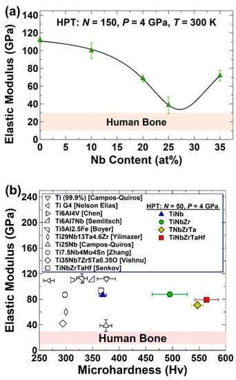 Ultra-SPD was recently used to achieve some of the highest hardness values ever reported for biomaterials by mechanical alloying of titanium with biocompatible elements such as niobium, zirconium, tantalum, and hafnium [52,57]. The applicability of ultra-SPD to almost any kind of system with a minor contamination effect allows synthesizing of bulk alloys with the best combination of high hardness and low elastic modulus [52,57]. Figure 5a shows the variation of elastic modulus against the niobium content in the Ti-Nb alloys synthesized by ultra-SPD. It is evident that a Ti-25Nb alloy (at%) can exhibit an elastic modulus comparable to human bone, while its hardness is as high as 370 Hv [52]. Further alloying to form ternary alloy TiNbZr, medium-entropy alloy TiNbZrTa, and high-entropy alloy TiNbZrTaHf lead to higher hardness values up to 565 Hv with moderate elastic modulus values close to 80 GPa, which are smaller than the elastic modulus of pure titanium [57]. A comparison of these findings with the reported data in the literature in Figure 5b confirms that the biomaterials synthesized by ultra-SPD show some of the best combinations of high hardness and low elastic modulus without the addition of toxic elements such as aluminum and vanadium [52,57].