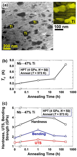- Edalati, K.; Daio, T.; Lee, S.; Horita, Z.; Nishizaki, T.; Akune, T.; Nojima, T.; Sasaki, T. High strength and superconductivity in nanostructured niobium-titanium alloy by high-pressure torsion and annealing: Significance of elemental decomposition and supersaturation. Acta Mater. 2014, 80, 149–158. [Google Scholar] [CrossRef]