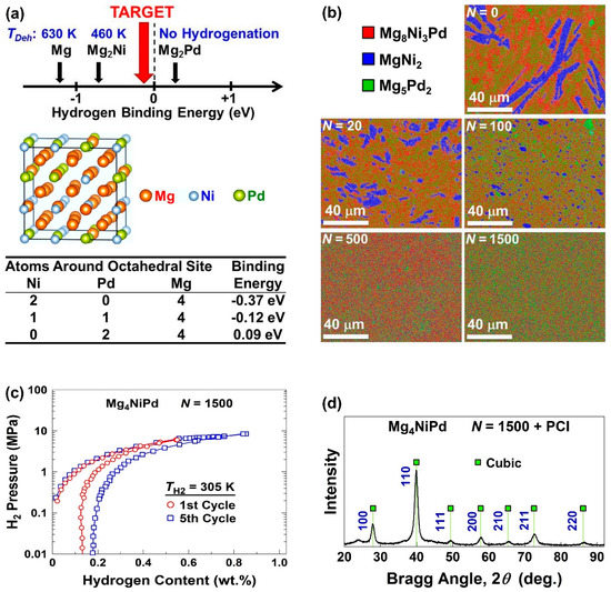 Hydrogen storage at room temperature in magnesium alloy designed by binding-energy engineering any synthesized by ultra-SPD. (a) Concept of binding-energy engineering used to design Mg4NiPd with appropriate binding energy at 1Ni-1Pd-4Mg octahedral sites. (b) Elemental mapping of Mg4NiPd before (N = 0) and after HPT processing for N = 20, 100, 500 and 1500 rotations. (c) Pressure-composition isotherms and (d) X-ray diffraction profile after five-cycle hydrogenation/dehydrogenation for Mg4NiPd synthesized by ultra-SPD via 1500 HPT turns [48].