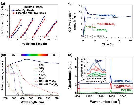 Application ultra-SPD for developing high-entropy oxides and oxynitrides as a new family of photocatalysts for photocatalytic hydrogen production and CO2 conversion. (a) Photocatalytic hydrogen production versus light irradiation time on TiZrHfNbTaO3N6 synthesized by ultra-SPD [58]. (b) Photocatalytic CO2 to CO conversion versus light irradiation time on TiZrHfNbTaO11 and TiZrHfNbTaO3N6 synthesized by ultra-SPD in comparison with P25 TiO2 benchmark photocatalyst [60]. (c) Light absorbance in TiZrHfNbTaO11 and TiZrHfNbTaO3N6 in comparison with binary oxides [58]. (d) Diffuse reflectance infrared Fourier transform spectra for TiZrHfNbTaO11 and TiZrHfNbTaO3N6 in comparison with P25 TiO2 where intensities of spectra at 665 cm−1 and 2350 cm−1 represent chemisorption and physisorption of CO2 on catalyst surface [60].