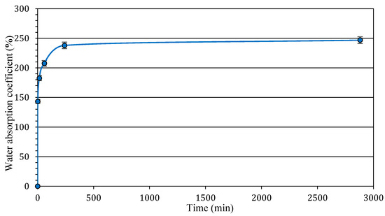 - Plant materials composed of 95% hemp shives and 5% hemp fibres. A characterisation of hemp shiv particles according to the recommendations of the RILEM TC 236 BBM Technical Committee was investigated [28]. Hemp shiv presented an absolute density of 1400 kg·m−3, bulk density of 140 kg·m−3, thermal conductivity of 0.048 Wm−1K−1 and hemp shiv particle size distribution ranging between 0.6 and 5 mm. Figure 1 shows the water absorption of hemp particles and shows that the maximum water absorption of hemp particles was approximately 247%.