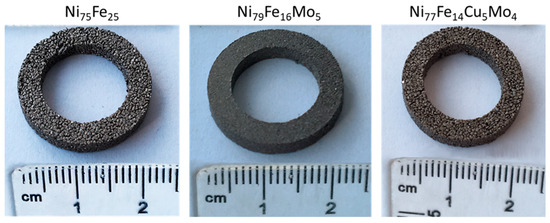 Using the milled powders, compacts were fabricated. The ring sample size and aspect after polymerization are presented in Figure 4. A very smooth surface is obtained for Ni79Fe16Mo5 samples, due to the smaller particle size of the powder.