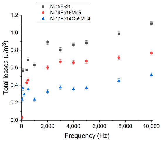 Total losses evolution for Ni75Fe25, Ni79Fe16Mo5, and Ni77Fe14Cu5Mo4 compacts measured at a field of Bmax = 0.01 T for frequencies up to 10 kHz.