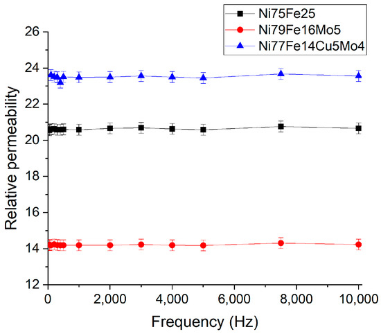 Relative permeability evolution in the frequency range 50 Hz–10 kHz for the Ni75Fe25, Ni79Fe16Mo5, and Ni77Fe14Cu5Mo4 composite compacts. The applied field was 0.01 T.