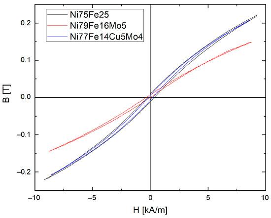 The hysteresis loops are practically identical for the Ni75Fe25 and Ni77Fe14Cu5Mo4 samples—samples with similar particle size distribution. For the Ni79Fe16Mo5 compact, a more tilted curve is recorded, in connection with smaller particle size. Smaller particle sizes will automatically induce a larger number of air gaps in the compacts and, consequently, larger demagnetizing fields. This will finally lead to a horizontal tilt of the hysteresis loop corresponding to the Ni79Fe16Mo5 compact, indicating a lower magnetic permeability of the compact. A similar conclusion was observed for NiFe-based compacts in [55]. The induction and the coercive field for each compact are given in Table 3.
