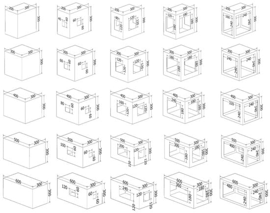 Both the assembly of the boxes and the gluing process were carried out by hand. For this study, 5 boxes with different lengths and 5 different cutout areas were used. Table 2 and Figure 2 show the configurations for the samples. Each sample had the same width and height of 300 mm. The ratios of the cutout areas to the sidewall were the following: 0%, 4%, 16%, 36%, and 64%, respectively. The cutouts were cut from the center of the sidewalls along all four sides. In order to evaluate the measurement results, 10 samples were tested for each cutout group for each dimension, for a total of 250 samples.