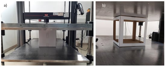 To observe and determine the maximum compression force, a BCT (box compression test) was performed on each box. This is a simple load test between a stationary and a moving steel plate. The device used for BCT measurements can be seen in Figure 3. During the tests, the compression force and deformation were continuously recorded. Before the test series, the samples were preconditioned at 30 °C ± 1 °C and 20–30% RH (relative humidity) for 24 h and then conditioned at 23 °C ± 1 °C and 50 ± 2% RH for 24 h in a climate-testing chamber in accordance with the ASTM D4332 standard []. Then, BCT tests were promptly executed after conditioning to avoid any additional hygroscopic phenomenon. BCTs were performed according to the ASTM D642 standard [], so the testing speed of the crosshead was 12.7 mm/min ± 2.5 mm/min until the failure of the box occurred.