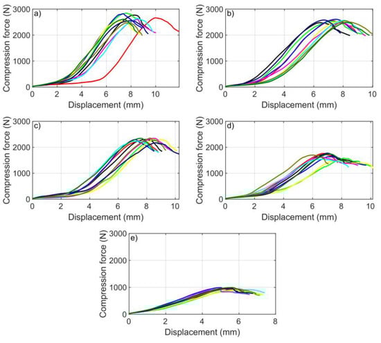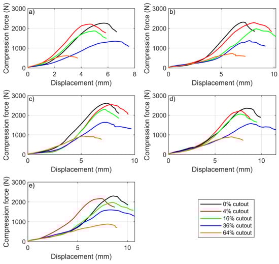 The force–displacement diagrams of the BCT measurements were drawn for all box variants. As a sample, for the boxes of 400 mm × 300 mm × 300 mm, five diagrams are presented for the cut and uncut samples with the ten measurements of each (Figure 4). Figure 4a shows compression force–displacement functions for the 0% cutout, Figure 4b for the 4% cutout, Figure 4c for the 16% cutout, Figure 4d for the 36% cutout, and Figure 4e for the 64% cutout. The numerical data for these measurements are also given in Table 3. For each additional box type, all the datasets are available, which can be requested from the authors.