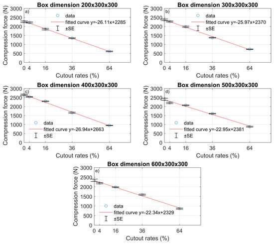 Using descriptive statistics, the average maximum compression force values were determined in each group (shown in Table 4). Figure 6 shows these average values and the standard errors related to the cutout areas. Based on the data points (Figure 6), it can be identified that there was a decreasing tendency in the average maximum compression forces, as in other studies [,,]. The statistical models were determined in the five box design groups using linear regression. These fitted lines can be seen in Figure 6. There were very high R2 values in each case, between 0.9904 and 0.9988 (Table 5). These indicate that the models described the measured data with very high accuracy. Using these linear functions, the compression forces could be predicted in each box dimension group separately if the box was made from single-wall B-flute corrugated cardboard. However, it has to be noted that in the model of 500 mm and 600 mm groups, there were residuals, so if the cutout rate increased up to 100%, there were residual compression force values that were not possible. The 400 × 300 × 300 group had the steepest regression slope and the highest y-intercept.