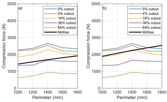 From the diagram, it appears that there was rather an optimum value (1400 mm perimeter), below and above which the measured BCT value decreased. However, in both the simplified and the full McKee context, the box perimeter is a multiplier, and hence, as the perimeter increases, the BCT values should also increase. Practically, it can be seen that an unlimited increase in the perimeter simply could not result in a linear increase in the BCT value.