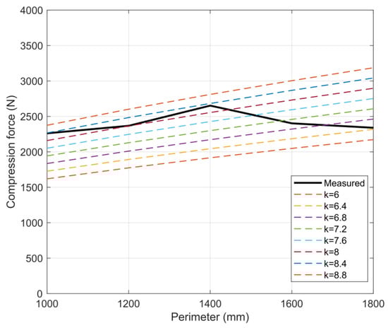 As shown in Figure 10, the value of factor k varied between 6 and 8.8 based on the perimeter linear growth of the simplified McKee relation, with a step size of 0.4. The averages of the measured BCT values for each box variation are shown in this interval. From the diagram, the coefficients k, applicable to each box size included in the measurement, can be assigned to that box size. This also implies that applying the same k coefficient to boxes of different geometric sizes would lead to an error in the estimation of the BCT value. For the cutout samples, the discrepancies were even more significant and could not be handled using the simplified McKee formula.