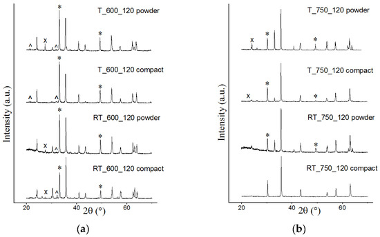 X-ray diffraction patterns of LiTi ferrite synthesized at 600 (a) and 750 (b) °C by T and RT heating of powdered and compacted Li2CO3/Fe2O3/TiO2 mixture. *—Fe2O3, ^—Li2CO3, X—TiO2.