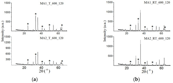 X-ray diffraction patterns of LiTi ferrite synthesized by T (a) and RT (b) heating at 600 °C for 120 min from Li2CO3/Fe2O3/TiO2 mixture mechanically activated at different energy intensity. *—Fe2O3.