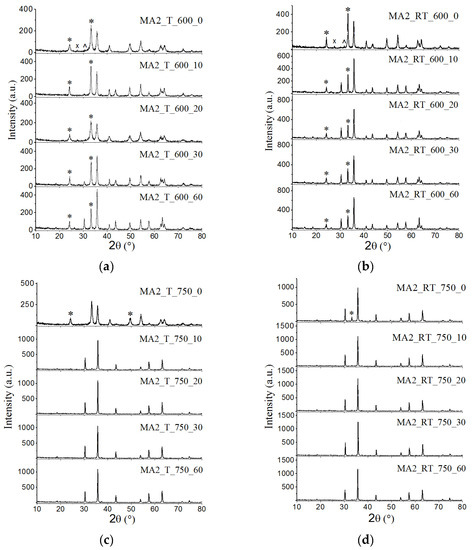 X-ray diffraction patterns of LiTi ferrite synthesized by T (a,c) and RT (b,d) heating at 600 (a,b) and 750 (c,d) °C for different isothermal holding times. *—Fe2O3, ^—Li2CO3, X—TiO2.