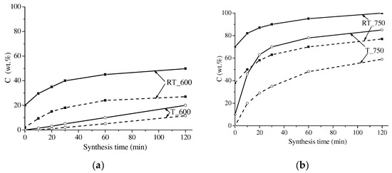 Concentration of spinel phases in LiTi ferrite synthesized at 600 (a) and 750 (b) °C from mechanically activated Li2CO3/Fe2O3/TiO2 reagents mixture: solid lines—activation at 2220 rpm; dotted line—activation at 1290 rpm.