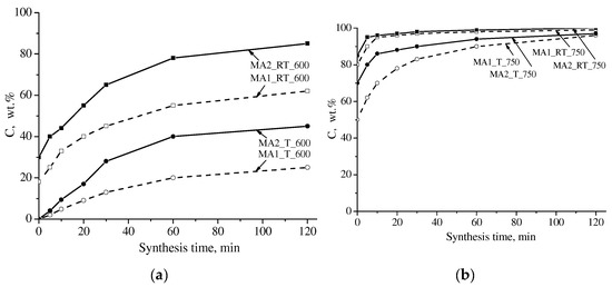 Figure 4 and Figure 5 show XRD patterns of the dependences of the spinel phase concentration in the synthesized samples at the synthesis time. Under thermal heating, at a synthesis temperature of 600 °C, the content of the spinel ferrite phase in the samples slowly increased with increased synthesis time. In this case, the concentration curves are linear. In all other modes, the concentration curves indicate the region of rapid accumulation of the spinel phase; its time interval depends on the treatment mode and the type of sample preparation; further it showed a slow increase in concentration over time.