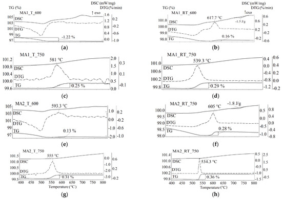 TG/DSC analysis of LiTi ferrite synthesized at 600 and 750 °C for 120 min from Li2CO3/Fe2O3/TiO2 mixture mechanically activated at different energy intensity. (a,b)—mechanically activated at rotation speed of 1290 rpm samples synthesized at 600 °C by T and RT heating respectively; (c,d)—mechanically activated at rotation speed of 1290 rpm samples synthesized at 750 °C by T and RT heating respectively; (e,f)—mechanically activated at rotation speed of 2220 rpm samples synthesized at 600 °C by T and RT heating respectively; (g,h)—mechanically activated at rotation speed of 2220 rpm samples synthesized at 750 °C by T and RT heating respectively.