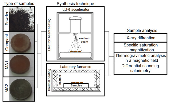 A synthesis method was previously developed to reduce the temperature and time of ferrite synthesis; it employs heating of the initial reagents by an electron beam with energies above 1 MeV [33,34,35,36,37,38,39,40,41]. High electron energies provide the possibility of volumetric heating of the synthesized samples, and the electron penetration depth depends on the density of the samples. The synthesis temperature can be controlled by changing the parameters of the electron beam, including the current density.