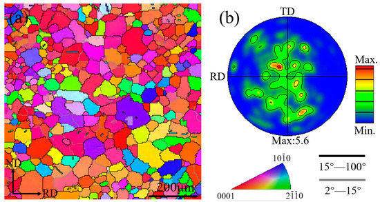 The inverse pole figure maps and (0002) pole figures of the sheet after cross-rolling and annealing are shown in Figure 1. The average grain size of the cross-rolled sheet was measured to be 38.2 μm. The sheet exhibited an inhomogeneous microstructural feature consisting of coarse and fine grains. In the (0002) basal pole figure, the grains were distributed along RD and TD, which indicated that the grain orientation can be modified by CR.
