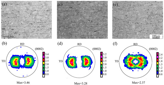 Optical micrographs and (0002) pole figure of ZX20 alloy plates prepared by different rolling parameters after annealing: (a,b) R1, (c,d) R2, and (e,f) R3.