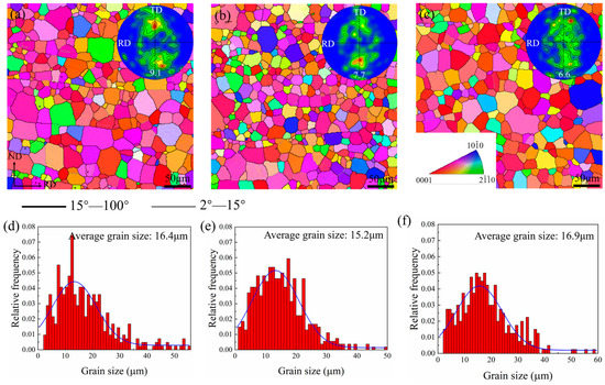 EBSD inverse pole figure maps (IPF), (0002) pole figures, and grain size distribution maps reflecting the microstructures and micro-textures of (a,d) R1, (b,e) R2, and (c,f) R3 annealed sheets.