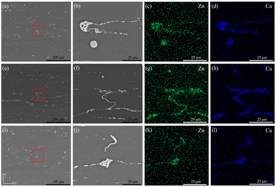 Figure 4 shows backscattered electron (BSE) images and energy dispersive X-ray spectroscopy (EDS) maps of the (a–d) R1, (e–h) R2 and (i–l) R3 as-annealed sheets. After annealing was performed, a large number of second-phase particles remained in the three sheets. Moreover, the second phase particles were obviously broken into small particles distributed along the grain boundary during rolling. According to the BSE images, it can be noticed that the area fraction of the second phase in the R3 sheet is relatively lower compared to that in the R1 and R2 sheets. For the R3 sheet, the large rolling reduction per pass was more favorable for the second phase to break into small particles, which may be dissolved into the matrix during annealing between passes. Among the three sheets only one type of second phase, enriched with Zn and Ca atoms, was present. In previous studies on the Mg–Zn–Ca alloy, it was suggested that Ca has a maximum solid solution of 0.2 wt.% at room temperature in magnesium alloys and that Ca solid solubility decreases with increasing Zn content [23,24]. Moreover, researchers have found a large amount of insoluble Ca2Mg6Zn3 phase in the Mg–Zn–Ca alloy [25,26]. Therefore, it can be confirmed that in this study, the second phase was Ca2Mg6Zn3.