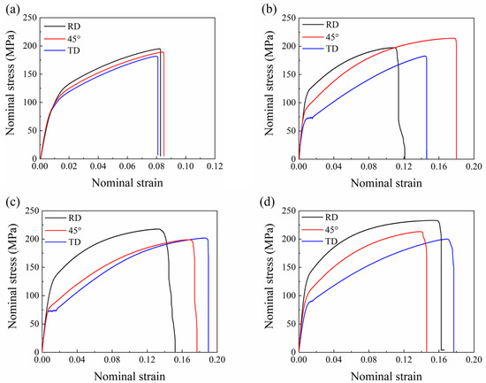 Nominal tensile stress–strain curves for annealed (a) CR, (b) R1, (c) R2, and (d) R3 samples along the RD, 45°, and TD.