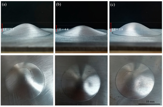The typical appearance of (a) R1, (b) R2, and (c) R3 annealing plates. These images were taken after the Erichsen cupping test at room temperature.