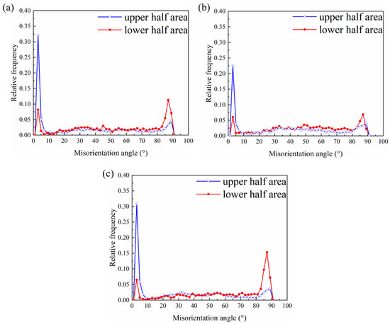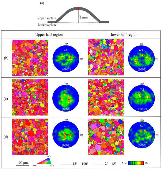 To understand the high formability mechanism of the R3 sample, the evolution of its microstructure and texture during stretch forming was analyzed via the EBSD technique. The EBSD data acquisition positions are shown in Figure 7a, and the position is close to the upper/lower surface. The IPF maps and (0002) pole figures of the three samples after the Erichsen cupping test to a 2 mm height are shown in Figure 7b–d. After 2 mm stretch forming, the angular distribution of the basal poles became distinctly narrower from RD and TD to ND compared to the annealed (0002) pole figure. Additionally, the (0002) basal texture intensities in the upper half region were stronger than those in the lower half region. It should be noted that the intensities of the basal poles in the corresponding region of R3 were the weakest among the three samples (Figure 7d). Figure 8 shows the misorientation angle distributions in the upper half region and lower half region for the 2 mm stretch-formed samples. As a sharp peak occurred near 86°, it is clear that a large number of tension twins were activated during the early stretch forming due to the fact that the {10–12} tension twins are intimately related to the misorientation angle approaching 86° [28,29]. The twinning fraction was the highest in the R3 sample and the lowest in the R2 sample. Meanwhile, the twin fraction was moderate in the R1 sample. This result was in agreement with the Erichsen cupping values of the sheets. From the distribution of the misorientation angles in Figure 8, a different characteristic of the misorientation angle between the upper and lower half areas of the samples after 2 mm stretch forming can be observed. The peak misorientation angle in the lower half region was near 86°, but the peak misorientation angle in the upper region was in the range of 1~5°. Further, sharp increases in the fraction of low-angle grain boundaries (LAGB) suggest that the initiation of dislocation slip deformation in the upper region occurred. This slip deformation was found to be of importance to the formability during stretch forming, especially to the formability of the non-basal slip.