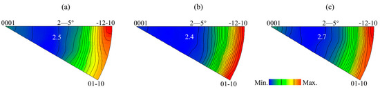 To determine whether non-basal slip was involved in the deformation during stretch forming, the in-grain misorientation axes (IGMA) were adopted to distinguish between the kinds of dislocations that were activated [30,31,32,33]. In this study, the misorientation angle of 2~5° of the grain was used to analyze the deformation mechanism during stretch forming, as shown in Figure 9 [34]. Across the three samples, the IGMA mainly lay along the [01–10]~[−12–10] arc, supporting those LAGBs that had a misorientation axis of [uvt0]. On the other hand, some IGMA were found to be lying along [0001], suggesting that there were LAGBs with a misorientation axis of [0001] in the R1 and R3 samples. However, no IGMA distribution along [0001] was found in the R2 sample. According to the IGMA analysis, it is likely that both basal <a> and pyramidal <c + a> slips were activated when the IGMA were lying between [01–10] and [−12–10]. The IGMA lying along [0001] can only be activated by prismatic <a> dislocations [31,35]. As the critical resolved shear stress (CRSS) for the pyramidal <c + a> slip was much higher than that for the basal <a> slip, it is difficult to initiate this at room temperature [36,37]. Thus, the effect of the pyramidal <c + a> slip on the formability at room temperature may have been negligible. Compared to the R2 sample, in addition to the basal <a> slip, the prismatic <a> slip was also involved in the deformation of the R3 sample. Therefore, it can be concluded that the high formability of the R3 sample was facilitated by the activation of the prismatic <a> slip, in addition to tensile twins.