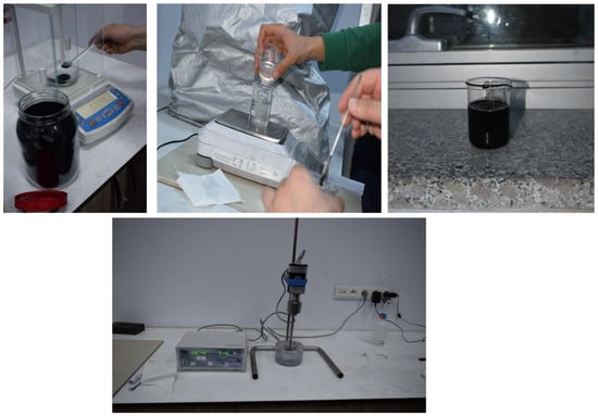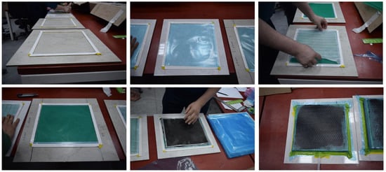 In order to manufacture composite material using the hand layup method, fabric layers were manually placed into the mold, and the epoxy resin was applied between each layer of the carbon fabric to completely coat the layer. By using a small roller, the air was trapped and evacuated. The process was performed at room temperature, and no curing process was carried out. By uniformly combining CNTs in epoxy resin and using the mixture of resin/CNT as the matrix of the composite, CNTRC was manufactured (Figure 1). The industrial method is a production method that uses atmospheric pressure to compress resin-impregnated layers together. The equipment that was used included a vacuum pump, peel ply, sealant tape, bagging films, carbon fabric, epoxy resin and infusion mesh (Figure 2). After layup was finished, the peel ply was applied over the layers to create a clean surface, and, over the peel ply, a layer of infusion mesh was placed to assist the flow of resin across and throughout the laminate during the resin infusion process. Layers were sealed in an airtight vacuum bag, and epoxy resin was transferred by force of vacuum and passed through the fabric layers. Like the previous method, the process was performed at room temperature, and no curing was carried out. Some of the advantages of this method are that no air is trapped, and uniform resin distribution is achieved.