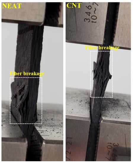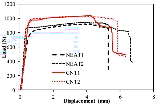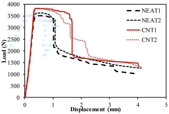 Load–displacement curves of the compression tests are depicted in Figure 6. The results demonstrate that the average compressive strength of CNT1 and CNT2 at the time of collapse was 17,291.76 N, while that of NEAT1 and NEAT2 was 15,661.21 N. Maximum compressive load values of CNT1 and CNT2 were 6% and 8.10% higher than those of NEAT1 and NEAT2, respectively, while CNT2 was 12.6% and 14.80% higher (Table 5). That is, it was determined that the samples with CNT carried an average of 10.4% more load than the samples with NEAT. All specimens reached the collapse position after approximately 2.5 mm of displacement. Another issue to be considered when comparing the samples with CNT and samples with NEAT is that the displacement amounts were the same under these loads. In other words, samples with CNT carried more load for the same displacement. In addition, the ratio of the maximum load value to the cross-sectional area of the sample (25 mm × 3 mm) and the stress values were also calculated (Figure 6). Damage formations in the samples occurred as shown in Figure 7. The experiment was terminated by observing fiber breakage damage as a result of typical pressure crushing. The initial stiffness values, that is, the angle of the curve with the horizontal, were higher in the CNT.