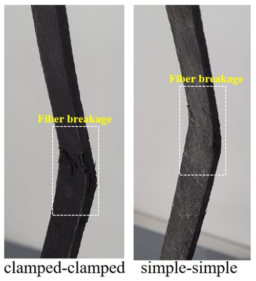 Final damage views on the samples are given in Figure 10. The final damage in both support boundary conditions was fiber breakage. However, this situation was observed more clearly in the clamped–clamped boundary condition.