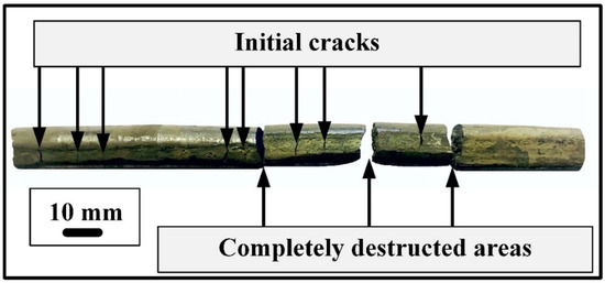 Albeit hot rotary forging, the most favorable forming technique for the processing of hard-to-deform metallic materials [36], was applied to produce long-length rods from initial ingots, only the first ingot with 1.5 at.% HF was successfully forged to a diameter of 3.5 mm and a length of 870 mm. Ingots with 3.0 and 5.0 at.% Hf were destructed (Figure 2) during the first few passes because of insufficient technological plasticity, presumably because of the increase in the amount of (Ti,Hf)2Ni-type brittle phase with the decrease in Ni content. The premature destruction of ingots during the process of rotary forging does not allow obtaining high-quality long-length rods. Therefore, further investigation of mechanical and functional properties, except the temperature range of martensitic transformations, was carried out only for the TiNiHf rod with 1.5. at.% of Hf.