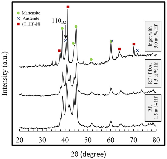 X-ray diffractograms of TiNiHf SMA rods with a diameter of 3.5 mm after RF and RF + PDA 550 °C for 2 h.