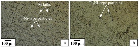 Analyses of the microstructure revealed that after rotary forging, a dynamically recrystallized structure with an average grain size in the range of 20–30 microns and a huge number of precipitated (Ti,Hf)2Ni-type particles was formed in the sample (Figure 4a). Post-deformation annealing did not lead to changes in the structure, noticeable by light microscopy (Figure 4b).